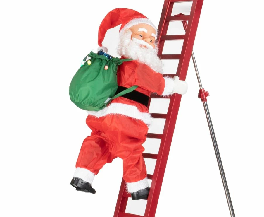 Santa climbs up and down his Christmas ladder, never tiring, as he carries a string of lights. The ladder attaches to any tree with the included arm and collar or lean the ladder against a wall.