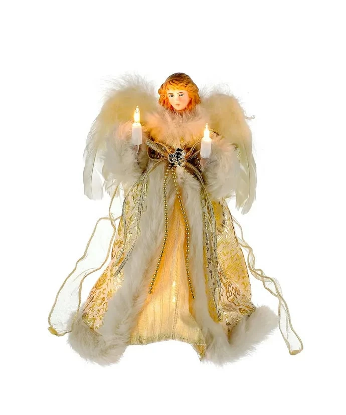This ivory and gold angel treetop is a beautiful and festive addition to your Christmas tree and overall holiday decor. The angel’s design includes an intricately-detailed shimmering gold gown which is trimmed in soft ivory faux fur. Her large ivory wings are accented with white feathers to complete her angelic look. Ten lights illuminate when plugged in for an extra festive glow.
