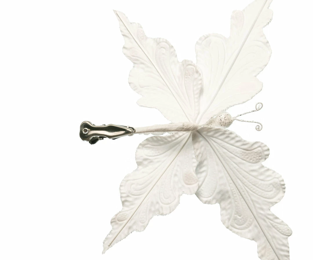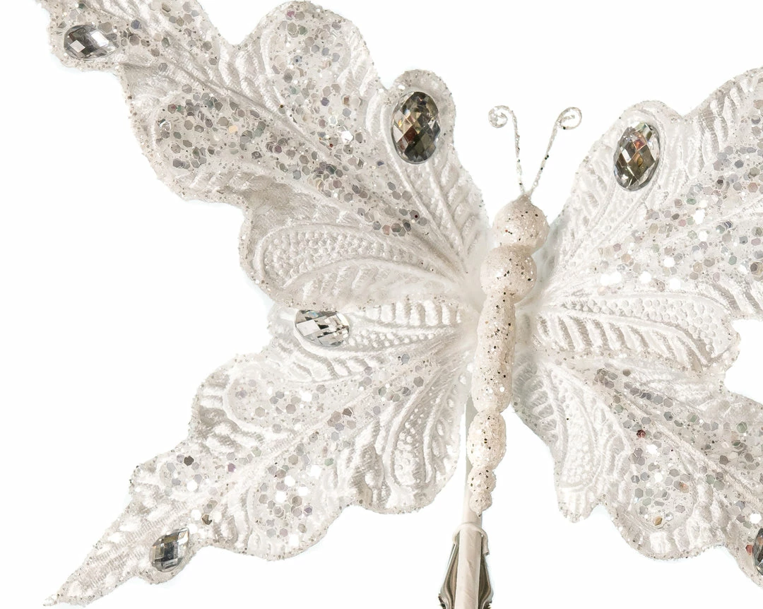 White glitter and gem butterfly, 10 inch size. Adds a touch of sparkle to Christmas trees and holiday decor.