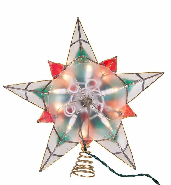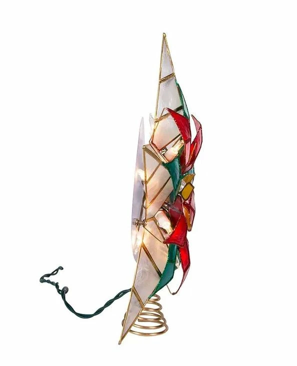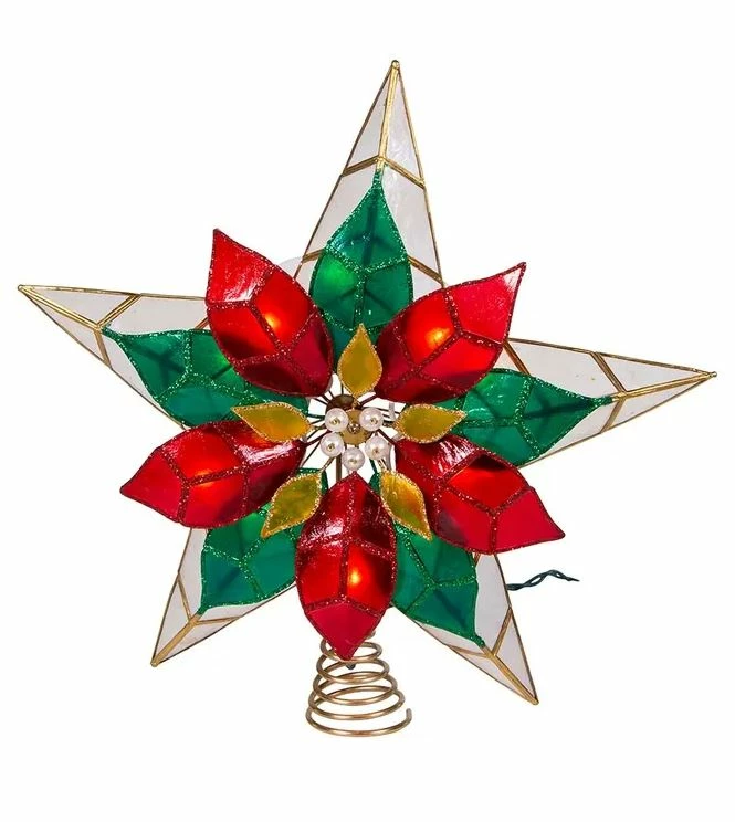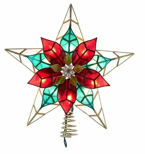 Complete your Christmas tree dΓ©cor with this gold capiz poinsettia star treetop. It’s poinsettia star design features capiz shell detailing with a multi-layered star, 10 warm white lights and gold trim throughout. It sits atop a gold coil, which attaches securely to your tree.