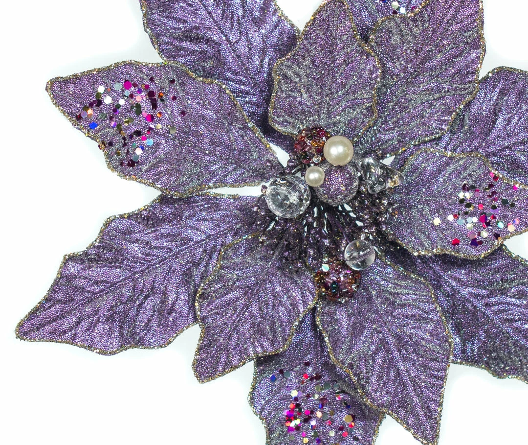 Add beauty and dimension to your tree this holiday season with this stunning glitter poinsettia stem. The soft sequined background, sparkly petals and gorgeous center makes this piece a must-have for your holiday collection.