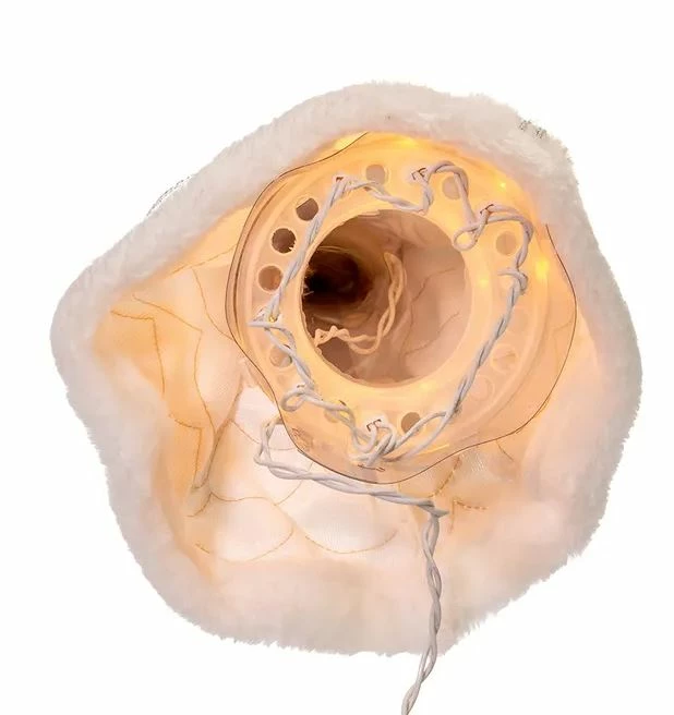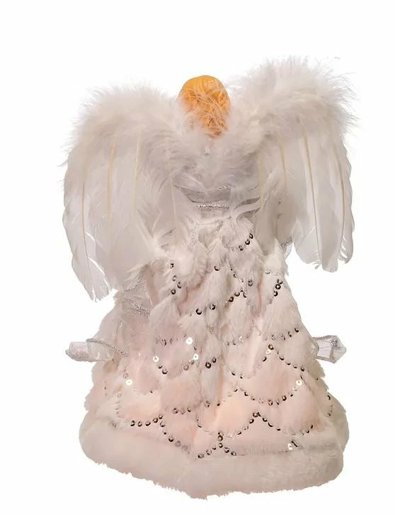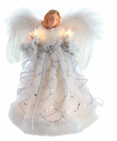 Top off your Christmas tree this year with this lovely white and silver angel treetop. This beautiful angel is wearing a white gown with white fur trim and silver sequined accents. She is holding lighted candles in both hands and has beautiful feathered wings.