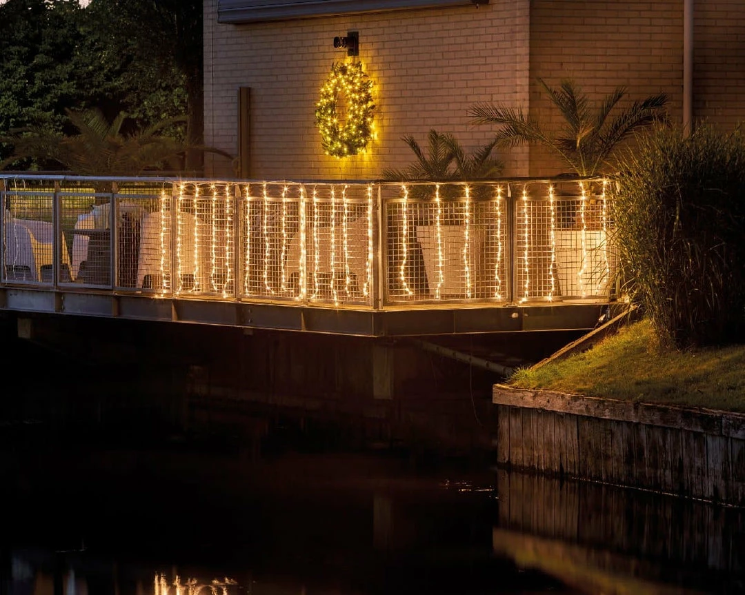 Celebrate the Season in festive style! Our LED Curtain Lights will help you transform your outdoor holiday dΓ©cor into an effortlessly fantastic display. They measure 13′ X 3.3′ and are brilliantly lit with energy efficient, long lasting, warm white, LED lights. The lights are in a curtain pattern on a transparent wire. The curtain creates uniformity giving you perfect spacing between lights. The color of the wire will easily blend with most backgrounds, making it practically invisible. It was designed for easy installation and versatility, simply hang the curtain in your desired location and you are Christmas ready. It is that easy!