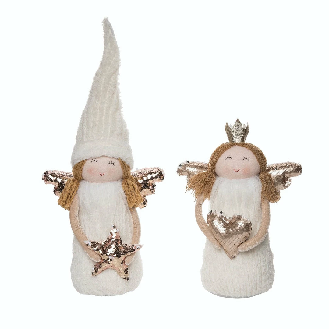 Add this gorgeous set of Angels to your holiday decor this season. These soft plush angels, provide innocent nostalgia, with their stawberry blonde angel hair, and sequined features, they are a must have!