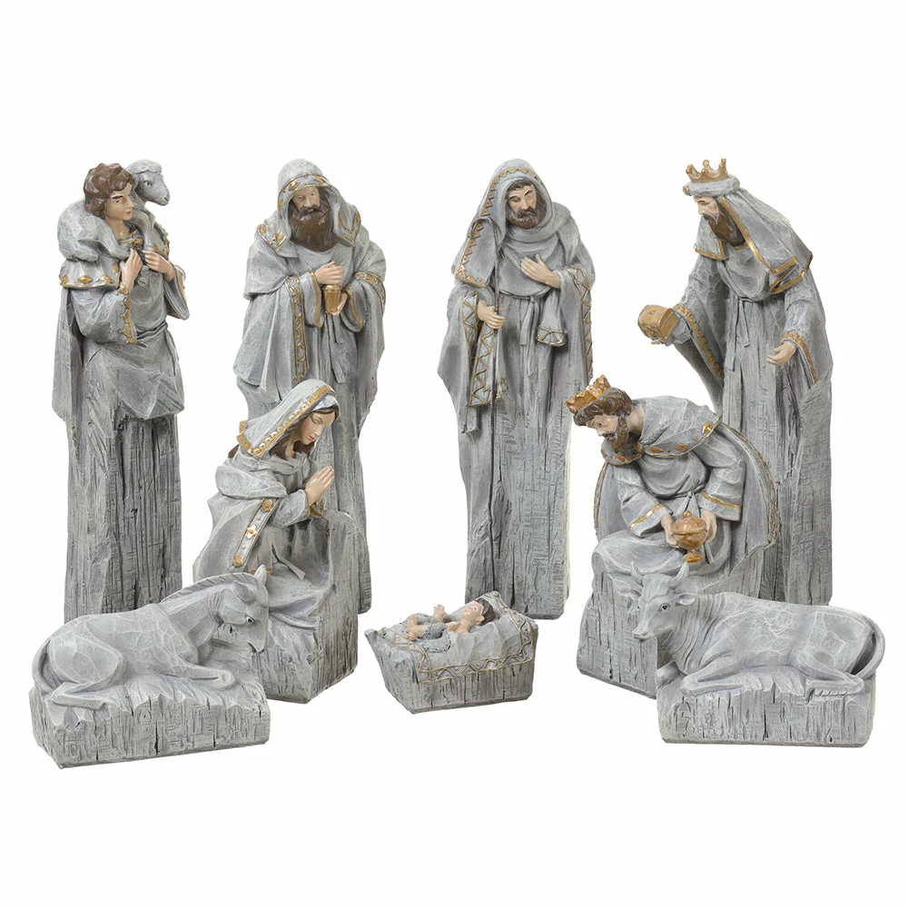 Add this beautiful religious grey toned nativity scene to any home decor. These set of nine comes complete with Mary, Joseph, Three Kings, the inn keeper and two farm animals all looking over baby Jesus in his manger. All beautifully decorated and detailed for you to add to under your Christmas tree. This modern yet rustic decor is also a perfect gift for your loved ones for all occasions.