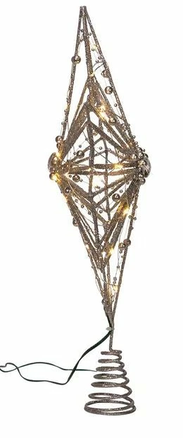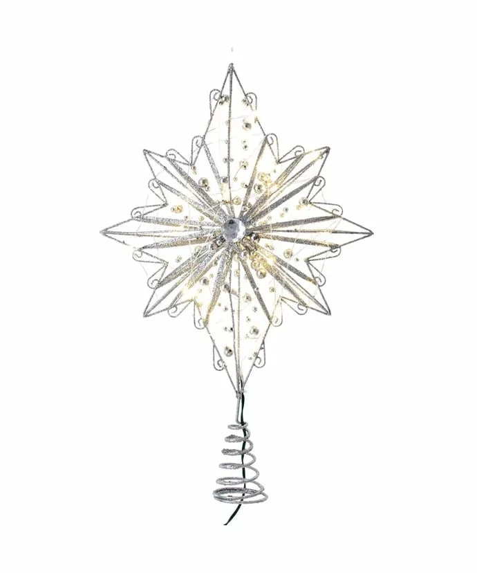 This 15.5-inch pre-lit silver glittered star treetop is a beautiful way to add to the dΓ©cor of your Christmas tree. With a traditional 8-point star style, this treetop has a scroll design with 30 warm white LED fairy lights and a clear gemstone center.