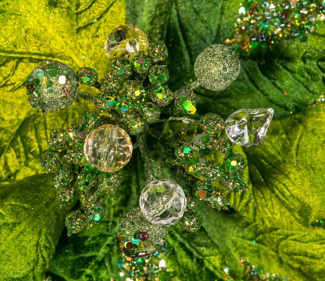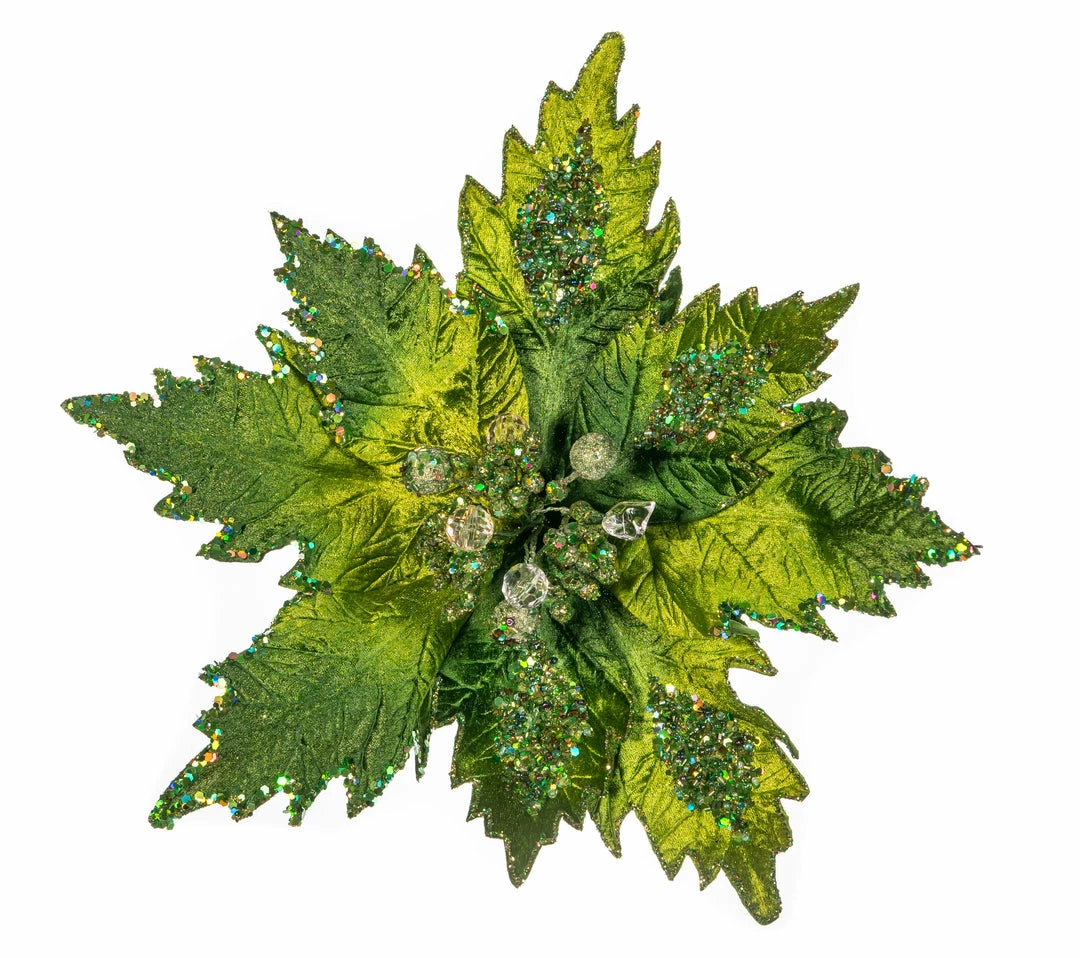 Elevate the look of your Christmas tree with these green velvet poinsettias. The true green color makes a lasting impression. Its velvet petals and jeweled center brings this entire piece stunning.
