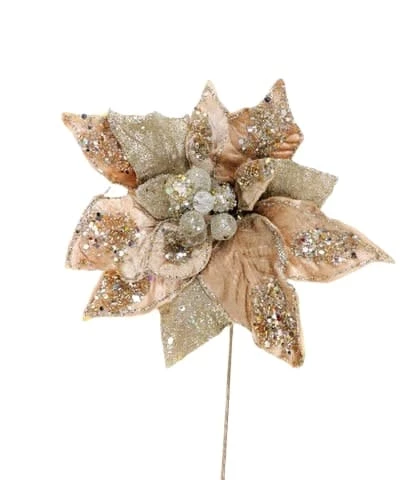 Classic and colorful, this beautiful poinsettia adds a warm and welcoming touch to your holiday decor. The simple yet soft velvety petals accented with the beautiful jeweled core make this versatile piece perfect for decorating any Christmas tree, wreath, or garland.