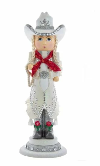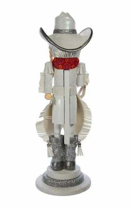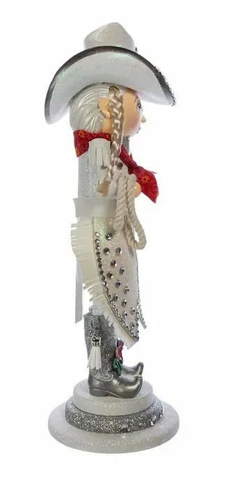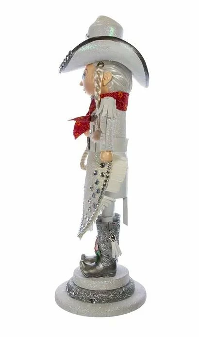 This 18-inch rhinestone cowgirl nutcracker features a cowgirl wearing a white western inspired outfit with silver boots, a red bandana and a white and silver glittered cowgirl hat. Her outfit is decorated with clear gemstones and she is carrying a rope in her right hand.