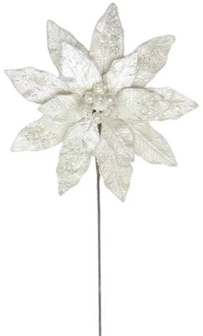 This elegant snow cream poinsettia stem with beaded glitter accents is the perfect holiday decoration. Use this to decorate your Christmas tree, wreath or garland.