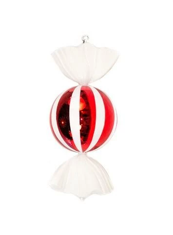 This adorable wrapped candy ornament combines the beauty and luster of glass with unbreakable practicality. With a shatterproof design, and featuring shiny red and white stripes, it looks good enough to eat! Coordinates perfectly with our Peppermint design theme.