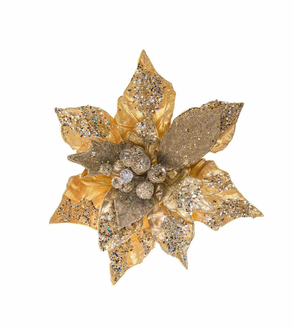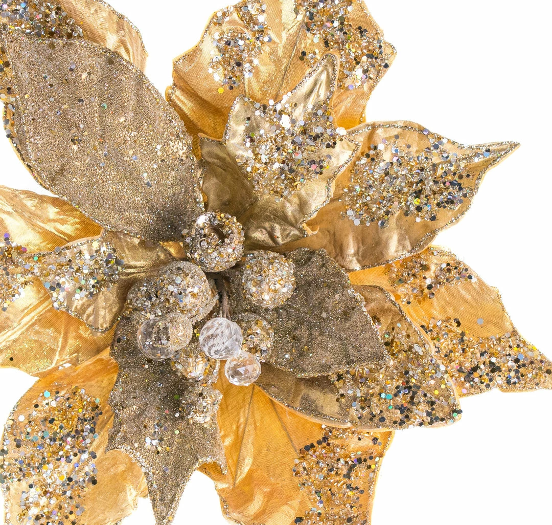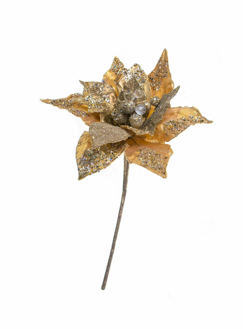 This gorgeous gold poinsettia stem is vibrant and the perfect otuch for your holiday decor. Add this to your Christmas tree, garland, or wreath this holiday season.