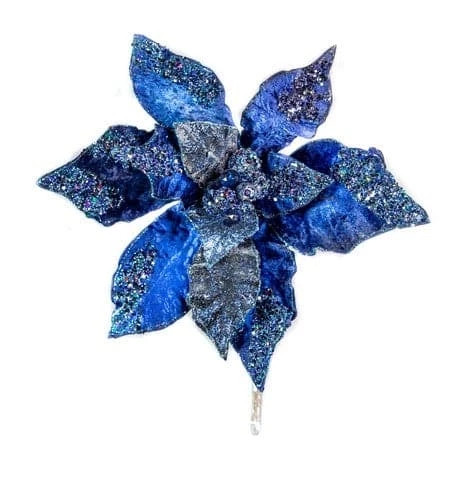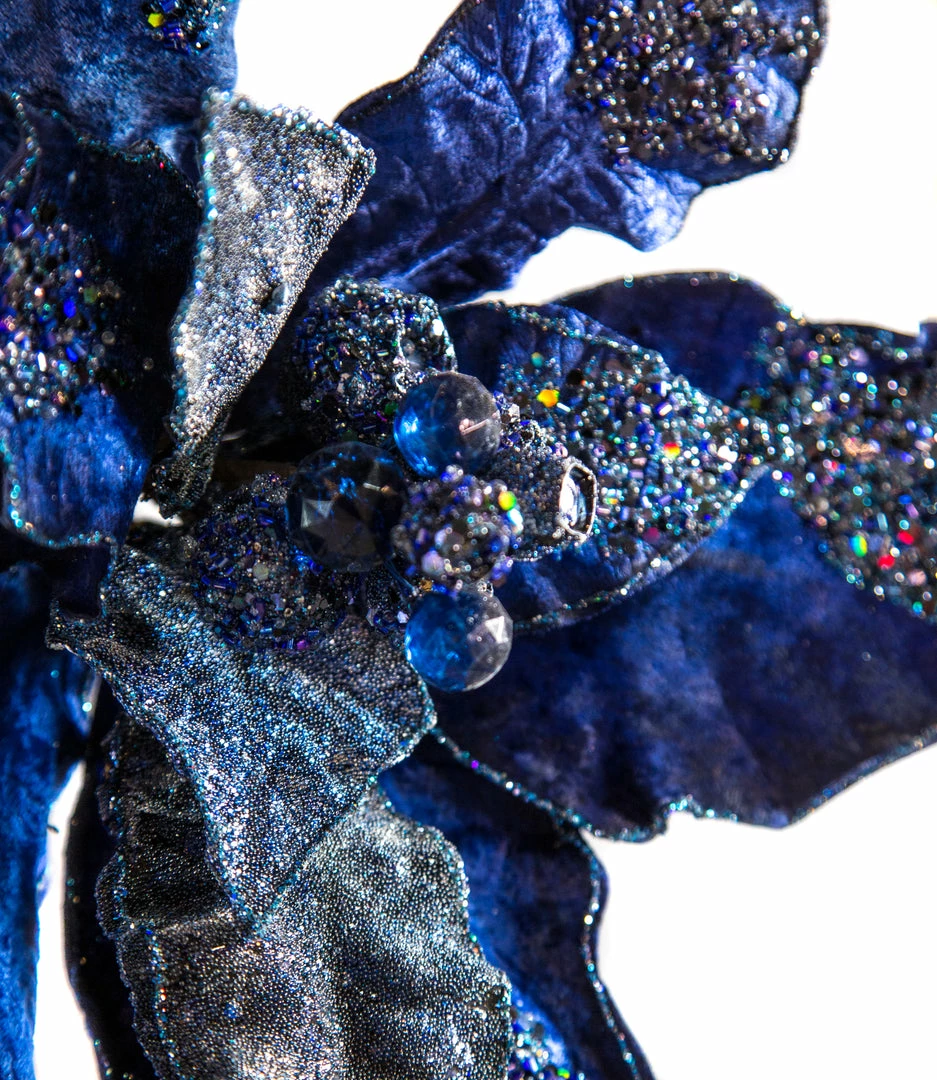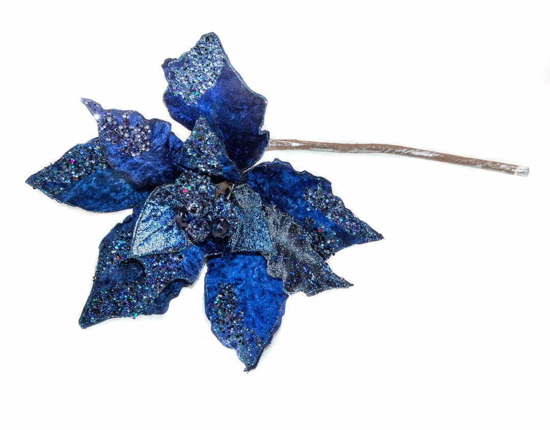 This Sparkling Navy Blue Velvet Artificial Poinsettia Pick is a decorator’s dream Christmas flower. Small and large, layering velour petals join to create a beautiful sparkling poinsettia bloom.