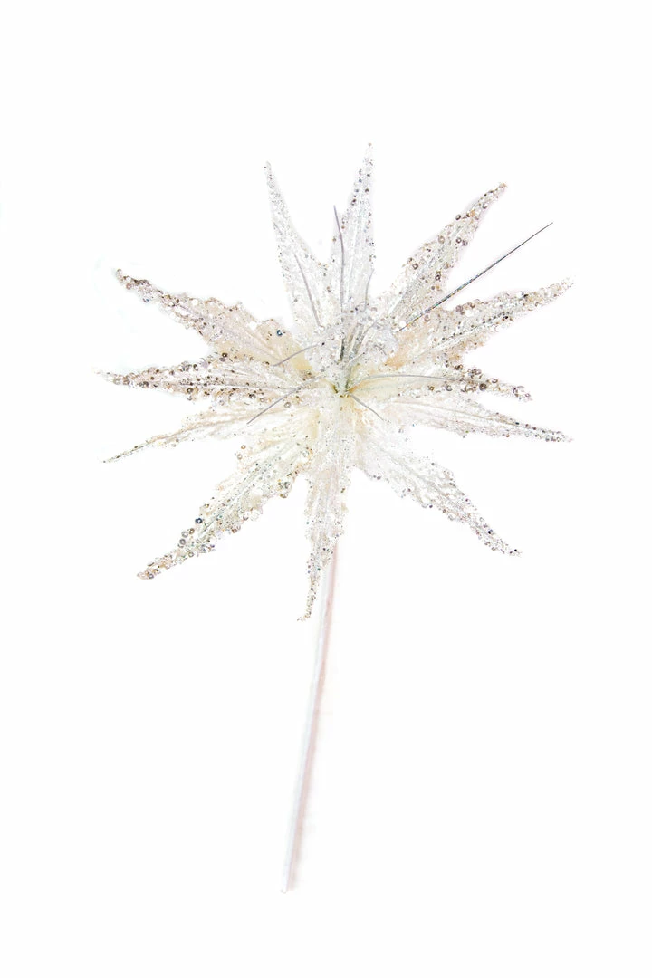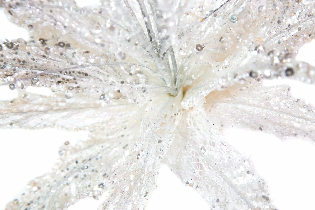 These beautiful poinsettia stems measure 20″ and feature the traditional Christmas flower in a vibrant white color. The edges of the petals are encrusted with sparkling pearl sequins and glitter that are sure to catch the light, adding shimmer and shine wherever you place them. Simply tuck them into the branches of your Christmas tree to add a touch of drama or place them in a vase for a lovely centerpiece. They come in a package of four.