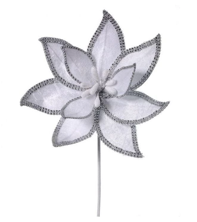 Add a classic, elegant touch with this beautiful 22″ Jeweled Edge Velvet Poinsettia Stem. It will add elegance and shine to any tree, wreath, or garland. The velvety white petals adorned with 2 rows of gorgeous jewels are accented with a white berry center. This beautiful flower combines well with shiny silver and white ribbons, ornaments, and sprays.
