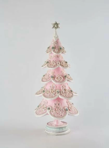 Frost and Tenderness Tabletop Tree measures 10.75 x 10.75 x 27 inches. The design features a pink layered tree on a blue base. The assorted gems, beads, embroidery gives depth and texture to this piece. Handcrafted with amazing detail by skilled artists, this holiday figurine would be the perfect decor on a mantel, shelf, desk, or coffee table. They can be combined with other decorative pieces like snowmen, gnomes, elves, angels, and more. A great collectible figurine to complete your Christmas decoration.