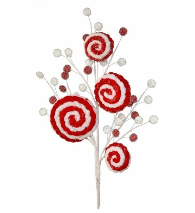 Add a touch of sweetness to your holiday decor this year with this spray of swirled red and white yarn-wrapped Lollipop, dusted with βsugarβ glitter and accented with sprays of red and white sugared candy.