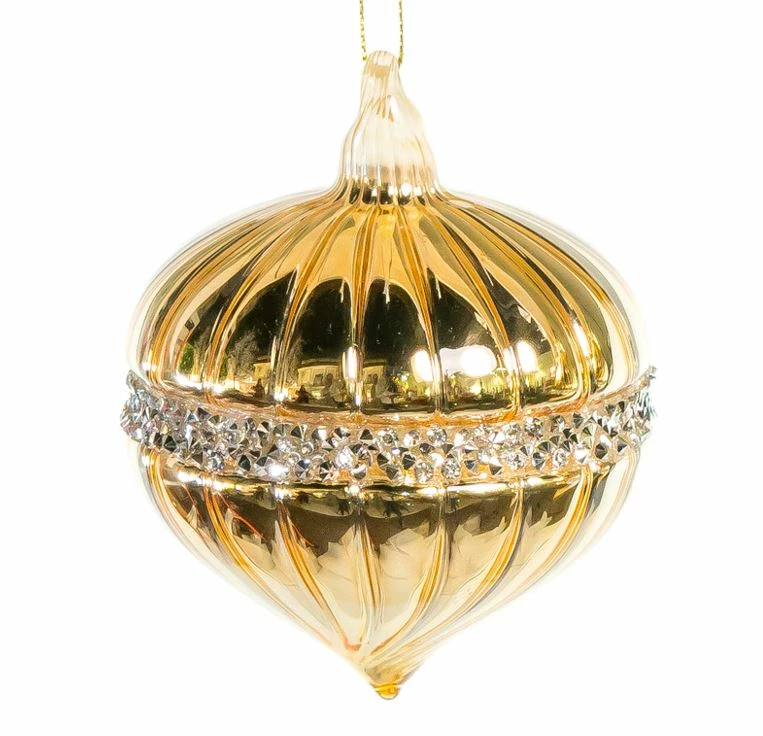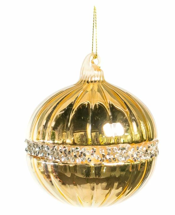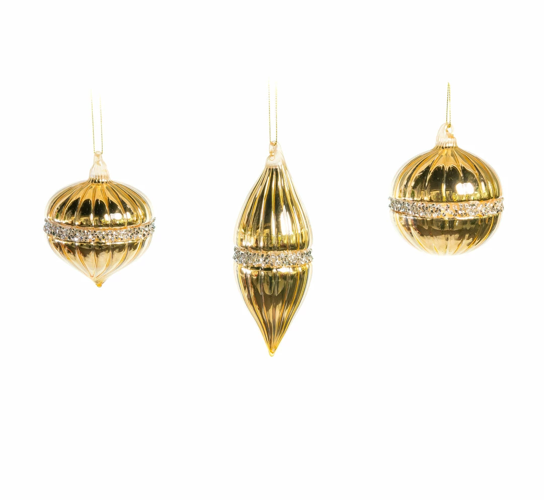 These stunning glass ornaments are a beautiful addition to your Christmas tree. Each ornament in this glass assortment is beautifully decorated with an intricate gold pattern detailed with jewels.