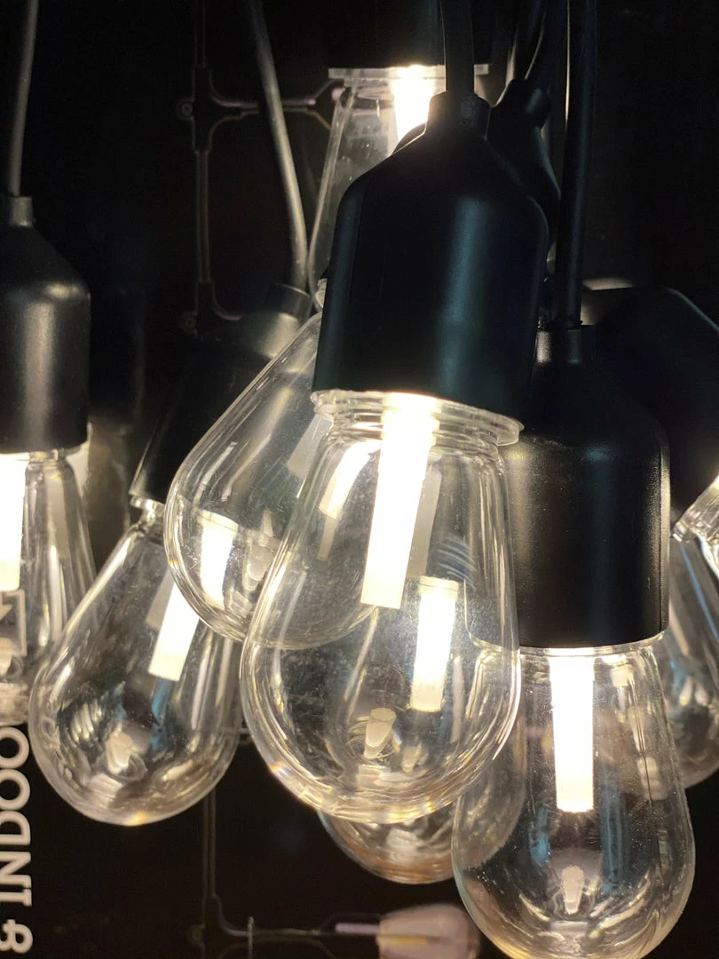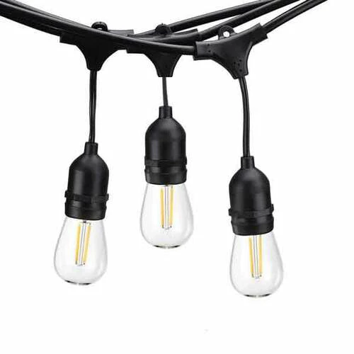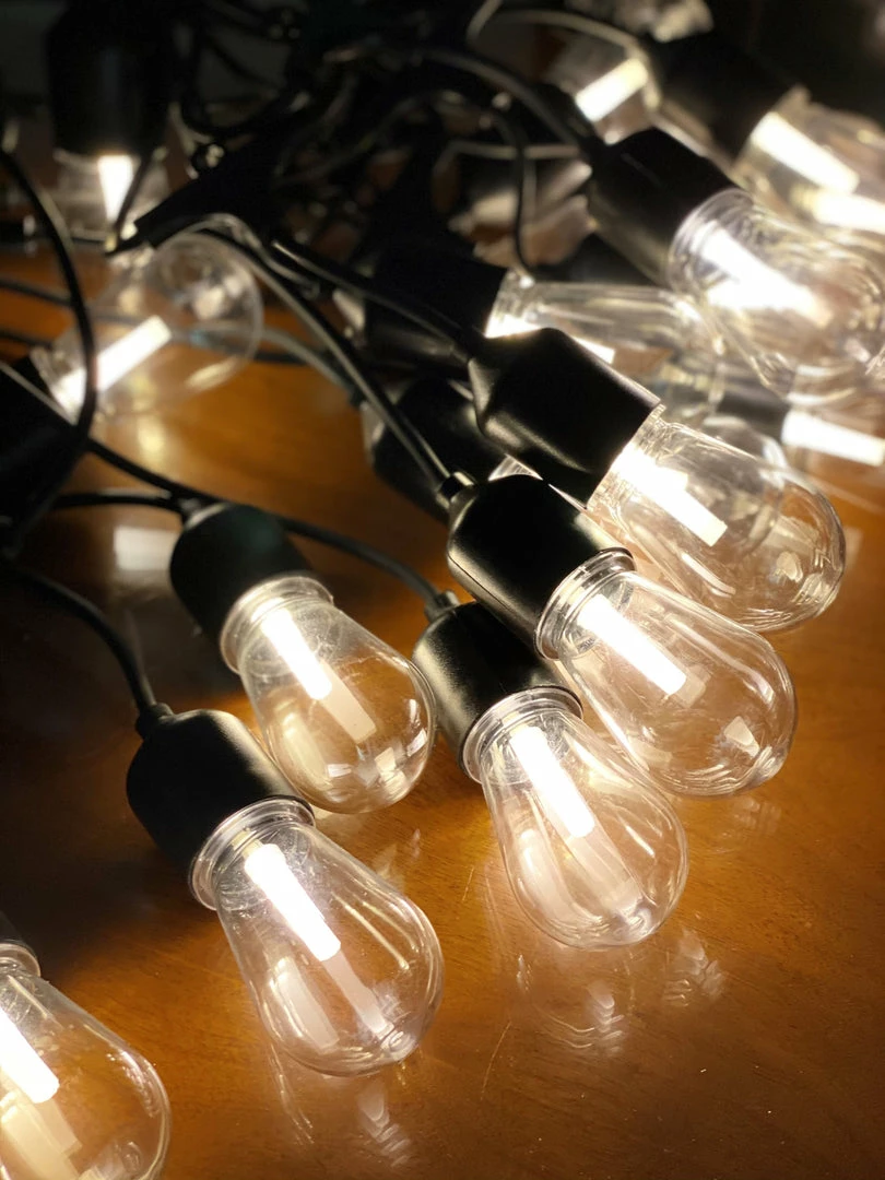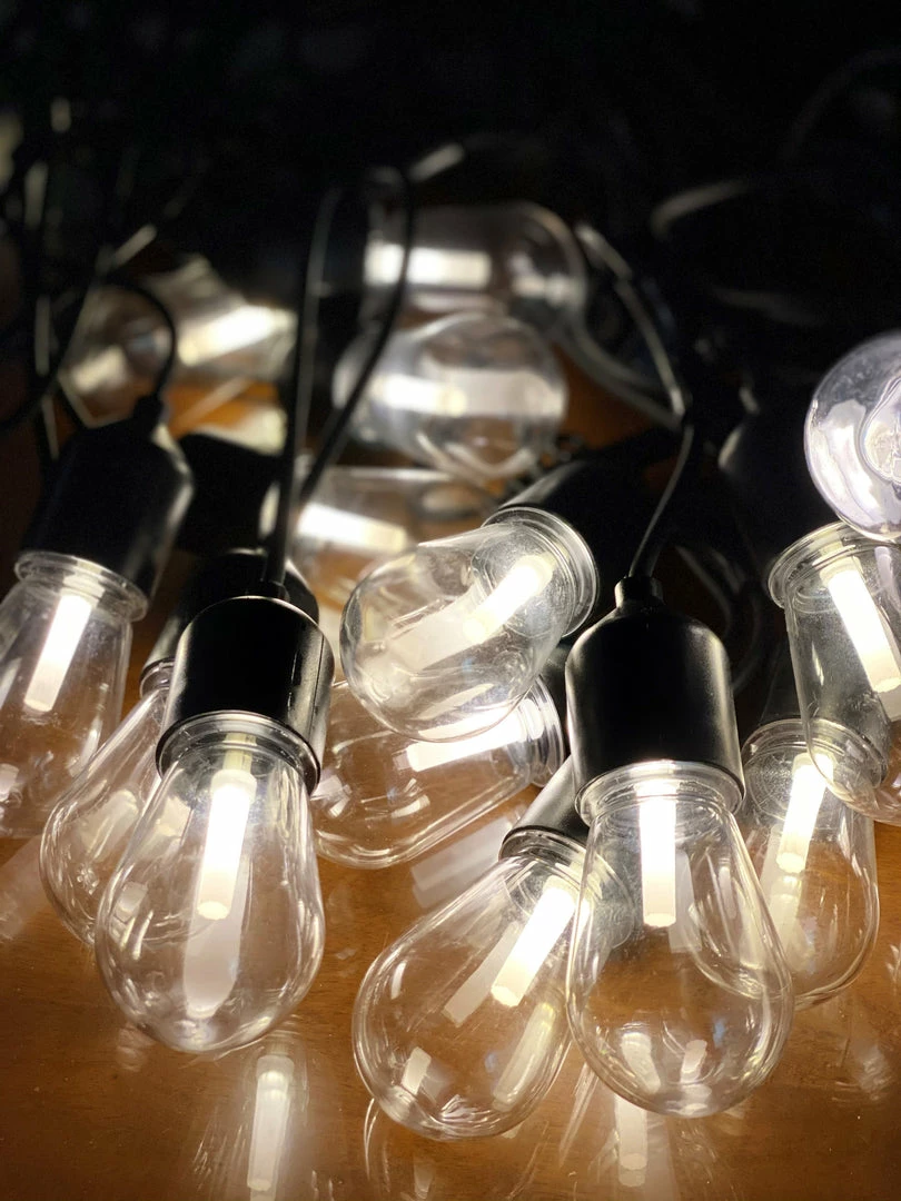 Features: Warm white light in a fashion-forward clear glass mini Edison bulb shape. Perfect for everyday use, parties or weddings. Extra tight fit between male and female ends assures lights remain on. Screw cap protects where each set connects together making them water tight 31.1 foot black cable with 20 lights per string making the cord nearly invisible at night.