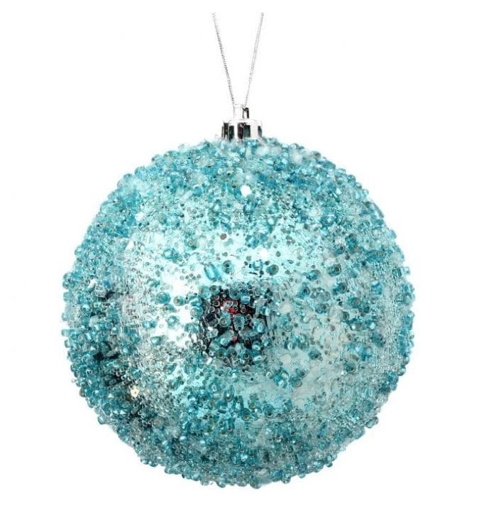 Add winter elegance to your Christmas decorations, with this beautiful blue iced ball ornament. This item will add sparkle to your holiday decor. This item arrives ready to hang and is perfect for hanging on the family Christmas tree.