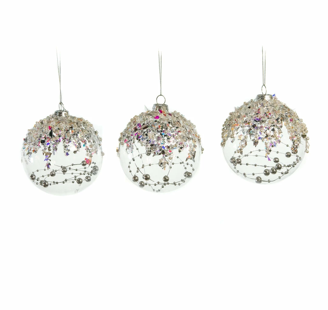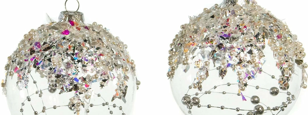 Add this unique Christmas ornament to your holiday decor. Features a clear glass, encrusted with sparkly beads and sequins. The perfect touch of elegance to your tree.