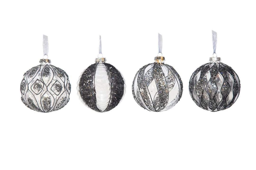 Add a whimsical touch to your decor with these captivating clear glass ornaments adorned with silver and back glittered designs.