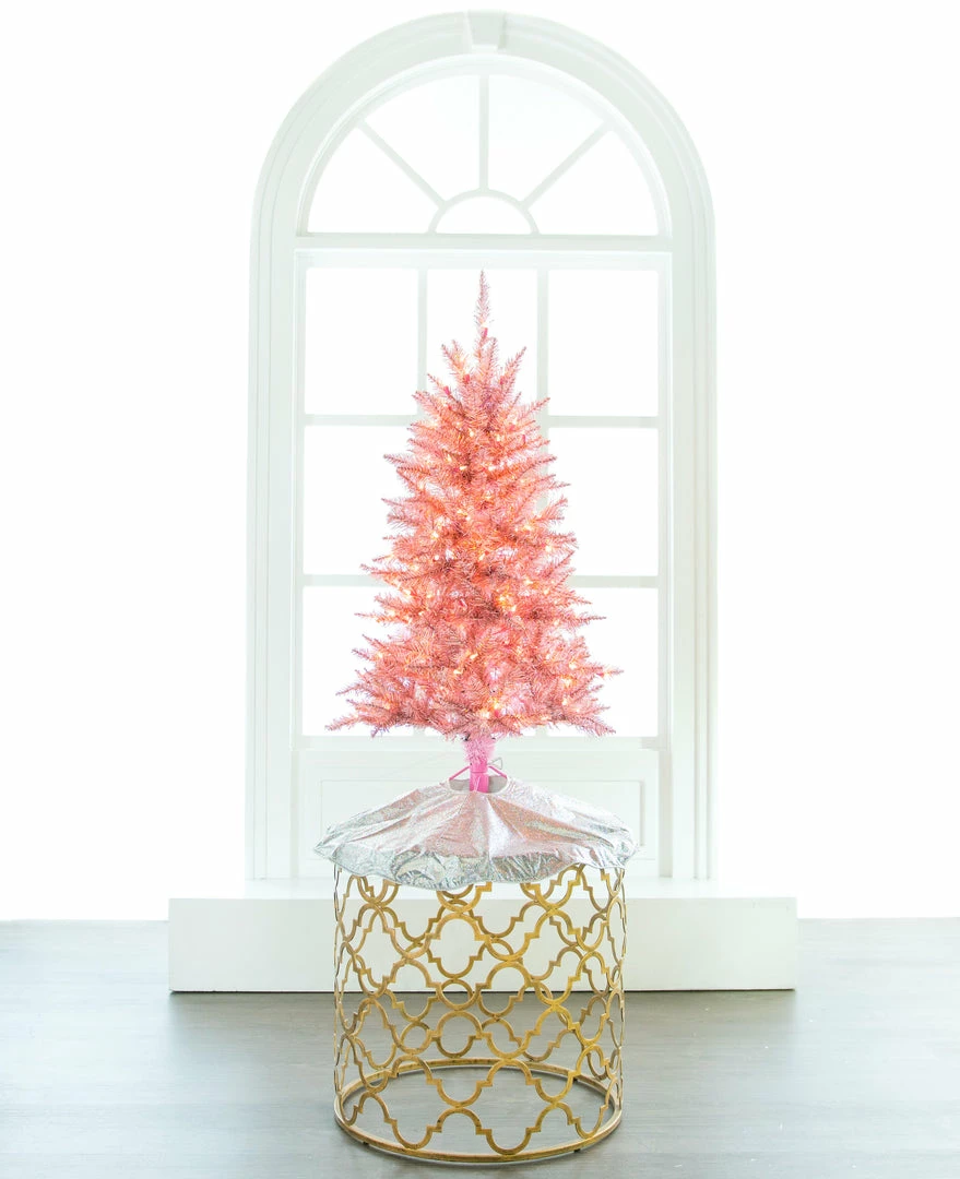 This artificial pine tree measures 4′ and is crafted with full dense branches in a lovely pink color. It is prelit with classic clear lights that illuminate the soft pink foliage. The perfect backdrop for a pink themed Christmas and a great alternative to a traditional green tree!
