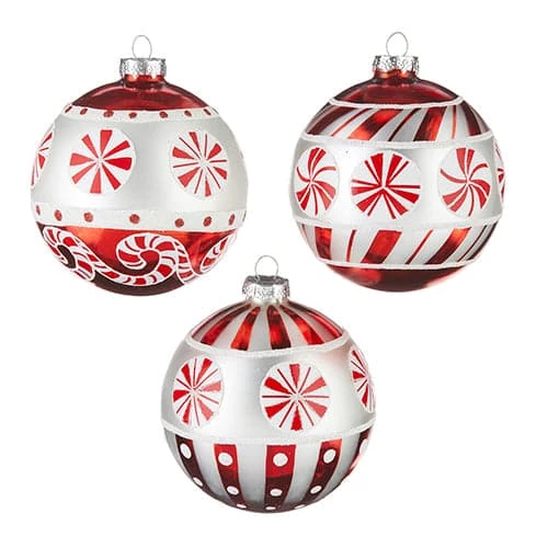 The perfect addition to any peppermint themed decor. This glass set is covered in red & silver metallic colors with white glittered accents, truly making the peppermint candies pop!
