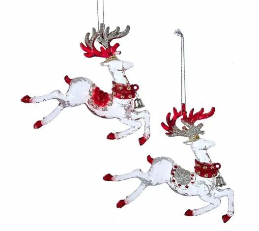 These regal red and translucent reindeer ornaments from Kurt Adler are a beautiful addition to any holiday dΓ©cor or Christmas tree. Each translucent reindeer in this assortment has red and silver glittered antlers and collar. One reindeer has a red blanket with silver glittered accents and the other has a silver blanket with red glittered accents.