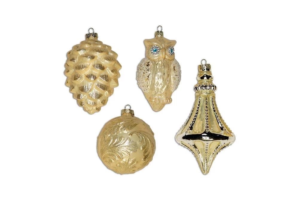 Exclusively designed by The Christmas Palace, this 24 pack of 4 designs brings an elegant touch to Christmas decorating. The set features champagne gold glass ornaments embellished with sparkling glitter, beads, and shimmering gem accents in a variety of designs. Included are several ineresting styles, such as owls and pinecones along with more traditional styles such as finial and round shapes. The combination of multiple shapes with the soft gold color palette gives an overall appearance of romantic luxury.