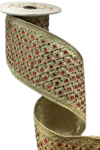 This beautiful ribbon combines luxury and tradition in the most opulent fashion. It measures 4″ X 5 yds and features a wired, soft gold ribbon with a delicate floral pattern embroidered with shimmering gold thread. The rich fabric is further embellished with sparkling red gems set into the pattern. An absolutely stunning ribbon that is sure to give your Christmas decor a touch of elegance!