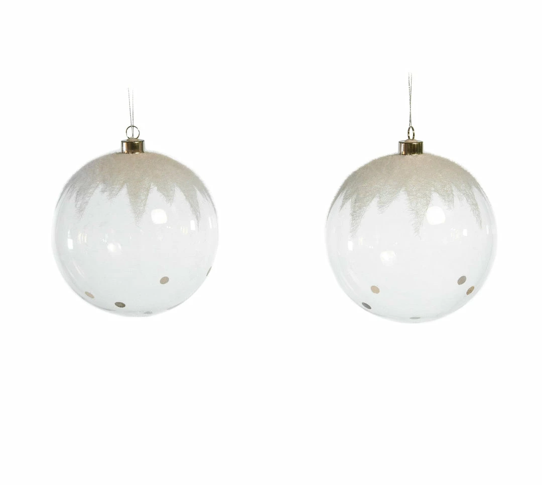 This clear ornament set is ready to pop in your winter decor. Topped with a textured snowy finish it will look perfect in your tree, garland or wreath!