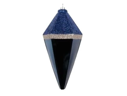 Add a wow factor with these prism shaped shatterproof ornaments. The top half is embellished with dark blue glitter and surronded by a silver glitter band. Whether it’s in your tree or garland it will be a great way to catch the light and brighten up your season.
