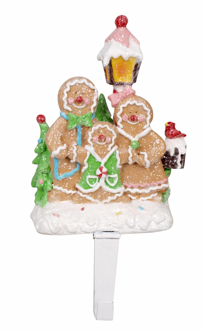 This stocking holder features an adorable gingerbread family on a wintery Christmas street. Sits flat atop your shelf or mantle to hang your Christmas stocking. Adds a yummy cozy feeling to your sweet Christmas decor.