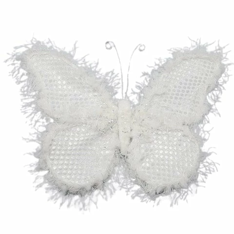 Add some sparkle to your tree or year-round decor with the lovely butterfly decor. The 4 wings are covered in fluff to help capture the lights plus there are sprinkled with silver iridescent small sequins.