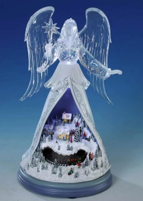 Christmas would have never looked so wealthy and stylish without these well chiselled iceberg blue angel village. When placed in the middle of your other seasonal furnishing or placed on mantle, fireplace or on your display table. These accent pieces are sure to wow everyone with its brillaint detailing – a keepsake decor that you will forever fall in love with. These pieces resemble an angel holding a magic stick with large wings. Base features a winter village covered with snow . The border of the angel’s dress is accented with decorative silver color. Perfect for Christmas decoration and so much more.