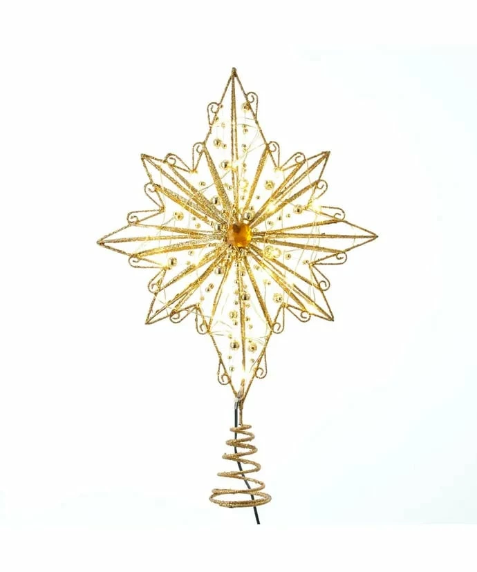 This 15.5-inch pre-lit gold glittered star treetop is a beautiful way to add to the dΓ©cor of your Christmas tree. With a traditional 8-point star style, this treetop has a scroll design with 30 warm white LED fairy lights and a gold gemstone center.