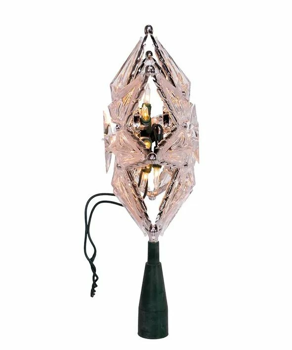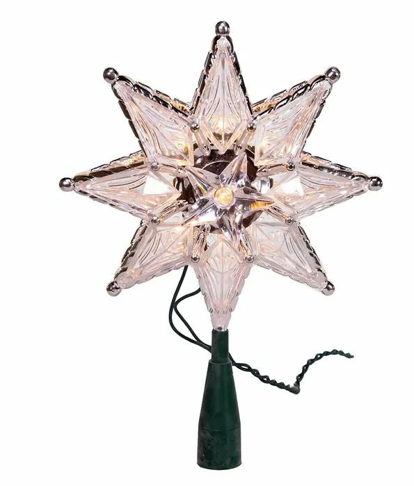 This 8-point clear star treetop is a beautiful and festive addition to your holiday dΓ©cor. This treetop has a classic star treetop design with a twist: in addition to the main design there is another 8-point clear star design inside the larger one. In the center of the treetop is a 4-point star. Three stars all combined into one treetop create a classic treetop look with a modern twist.