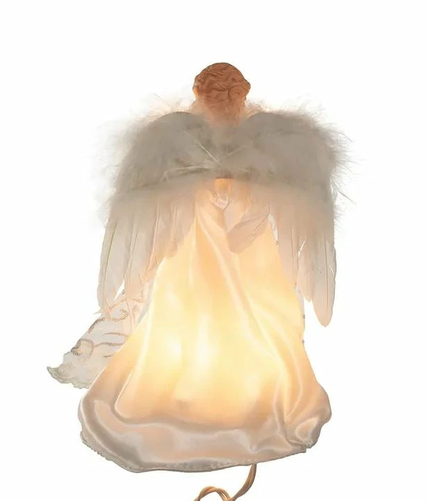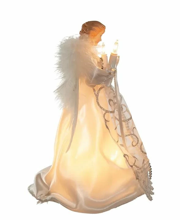 Add to the lighting and dΓ©cor of your Christmas tree with this white and silver angel treetop. This beautiful angel is dressed in a snow-white gown with silver accents. She is lighted from within her dress and her candles. This is sure to be the perfect finishing touch to any tree.