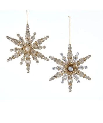 Kurt Adler’s light gold and silver snowflake ornaments are an elegant addition to any holiday display or Christmas tree. This assortment features two light gold and silver glittered snowflakes. Each snowflake is uniquely shaped with either a clear gemstone center or a white pearl center.