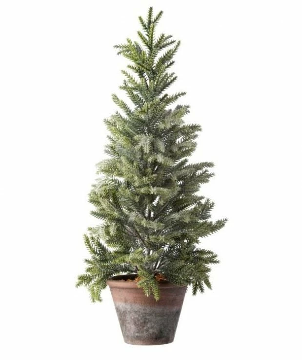 Dress up your entryway with this 24-inch Frosted Mini Spruce Tree. Conveniently set in a weathered resin pot for easy placement. Create a charming symmetrical display and set on either side of your front door or walkway.