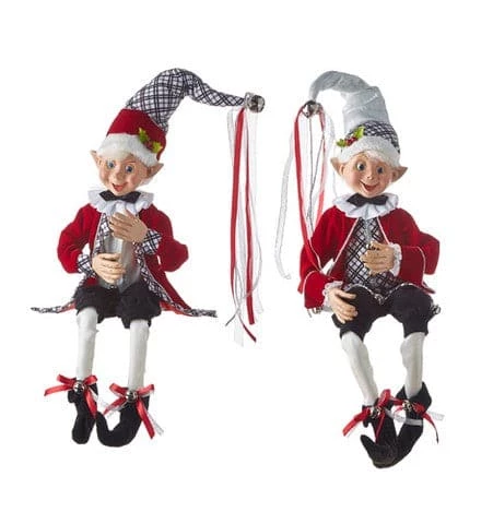 Add both of these fun elf decorations to any holiday decor. They bend for arranging on a shelf, on top of a cabinet, or even to sit between branches of your tree. Both have long stocking hats with ribbon streamers, silver with black crisscross patterns, red jackets and black elf shoes. All sides are wonderfully detailed. The attire is created with high quality fabric attire and stitching.
