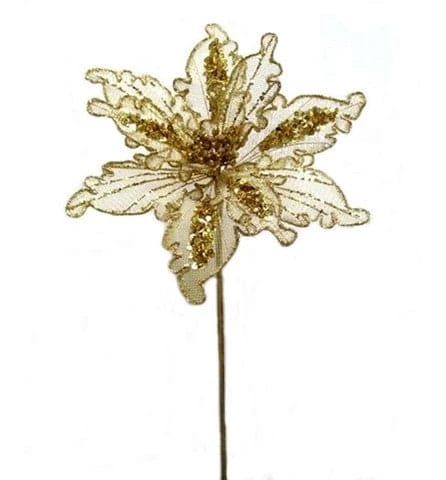 This beautiful and vibrant stem adds an elegant twist to the classic gold Christmas poinsettia. The gold-toned net like petals are lined with a stunning sequined edge, brought together by a glittery gold center. This luxurious yet timeless flower is perfect to display in a vase, tree, wreath, or garland.