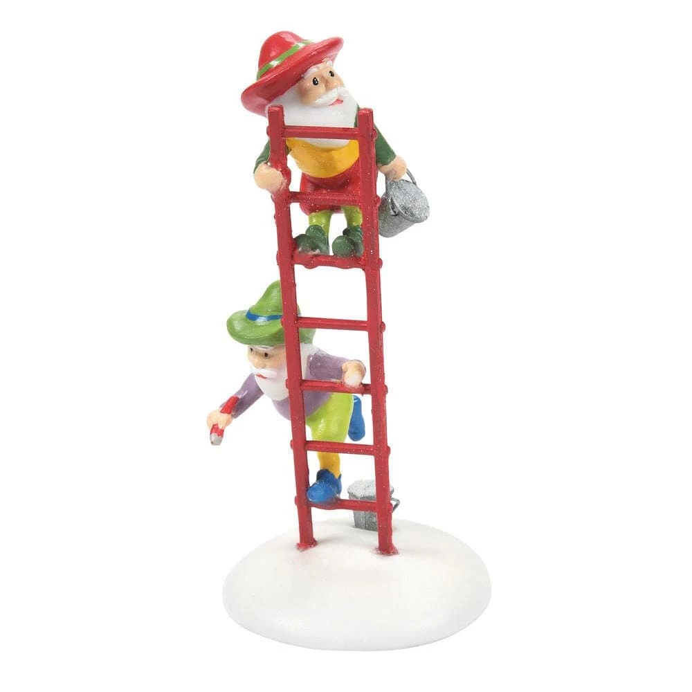 Up on a ladder, these elves are adding a few sparkles to the new “Norny’s Ornament House.”