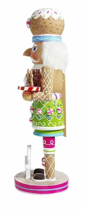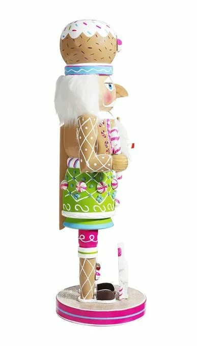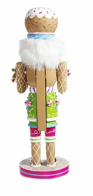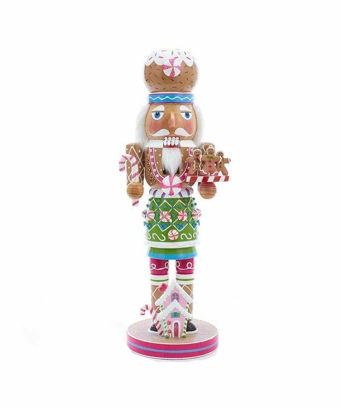 This 16-inch Wooden Gingerbread Nutcracker is a fun and unique addition to any holiday dΓ©cor or nutcracker collection. The nutcracker features various Christmas desserts and peppermint candy detailing throughout. In one hand is a candy cane and the other a plate of gingerbread cookies. A gingerbread house stands at the base. Perfect for the person with a sweet tooth in your life!