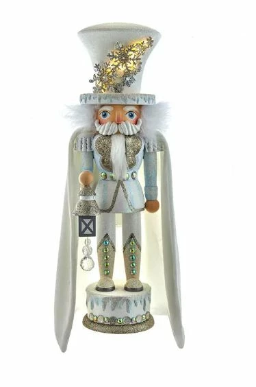 Hollywood Nutcrackersβ’ is a whimsical collection of nutcrackers created exclusively for Kurt S. Adler, Inc. and features an assortment of designs that put a unique, vibrant, memorable twist on traditional nutcrackers. This 18-inch battery operated LED white snowflake soldier nutcracker features a white and champagne gold glittered color scheme with iridescent gemstone accents, champagne glittered boots and a white snowflake hat. In one hand he is holding a glittered miniature lantern and is standing on a matching base . This nutcracker’s white snowflake hat is illuminated from within for a soft warm glow and is a stunning addition to any holiday dΓ©cor.