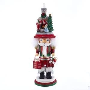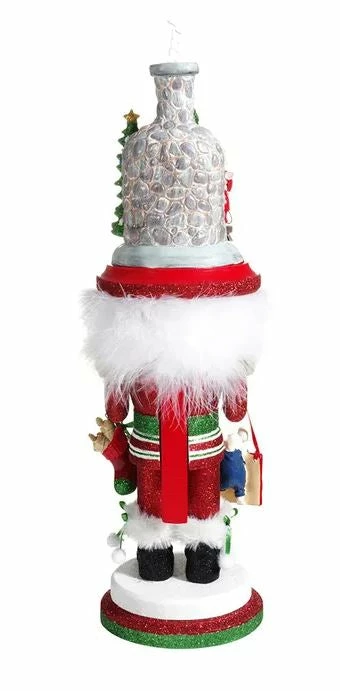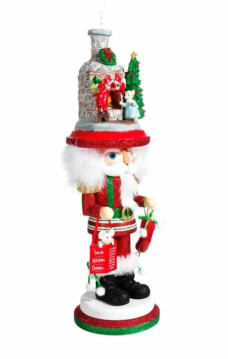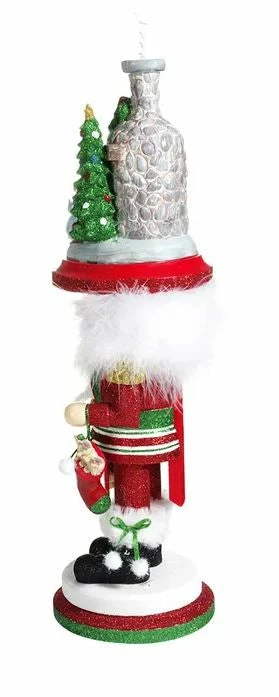 A must have this holiday season! This 17.5″ wood nutcracker by Kurt Adler is full of charm! He is dressed in traditional Christmas colors, red, green, and white. His suit is embellished with shimmering glitter accents and his black boots are trimmed with faux fur. In his hand he holds a stocking stuffed with goodies and in the other he carries a bucket holding a furry little friend. He is designed with so many darling details, but his best feature is his large headress! On top of his fluffy white hair sits a hat that is sure to delight, featuring a fireplace and chimney scene complete with burning logs, smoke, decorated Christmas tree, wreath, and stockings hung with care! He is sure to warm your home this season and inspire feelings of nostalgia!
