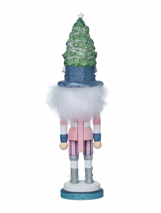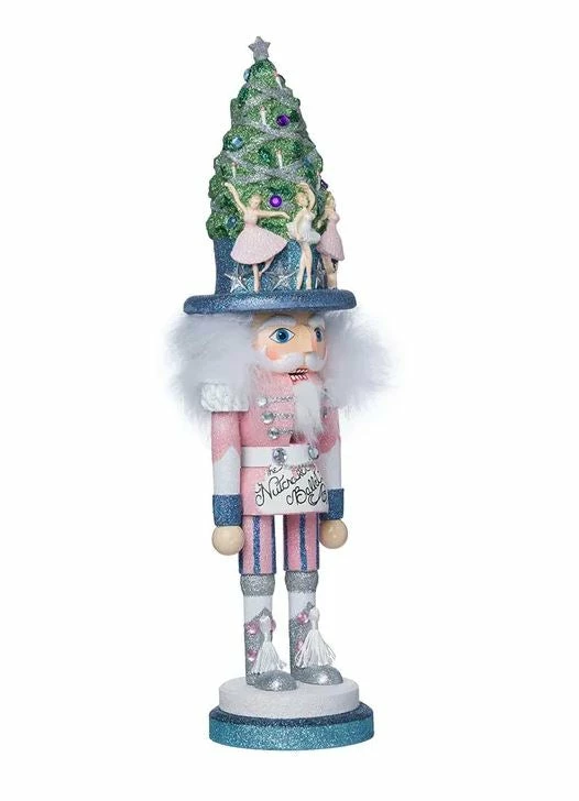 This Hollywood Nutcrackersβ’ Ballet Nutcracker features a Christmas tree hat surrounded by beautifully posed ballerinas.