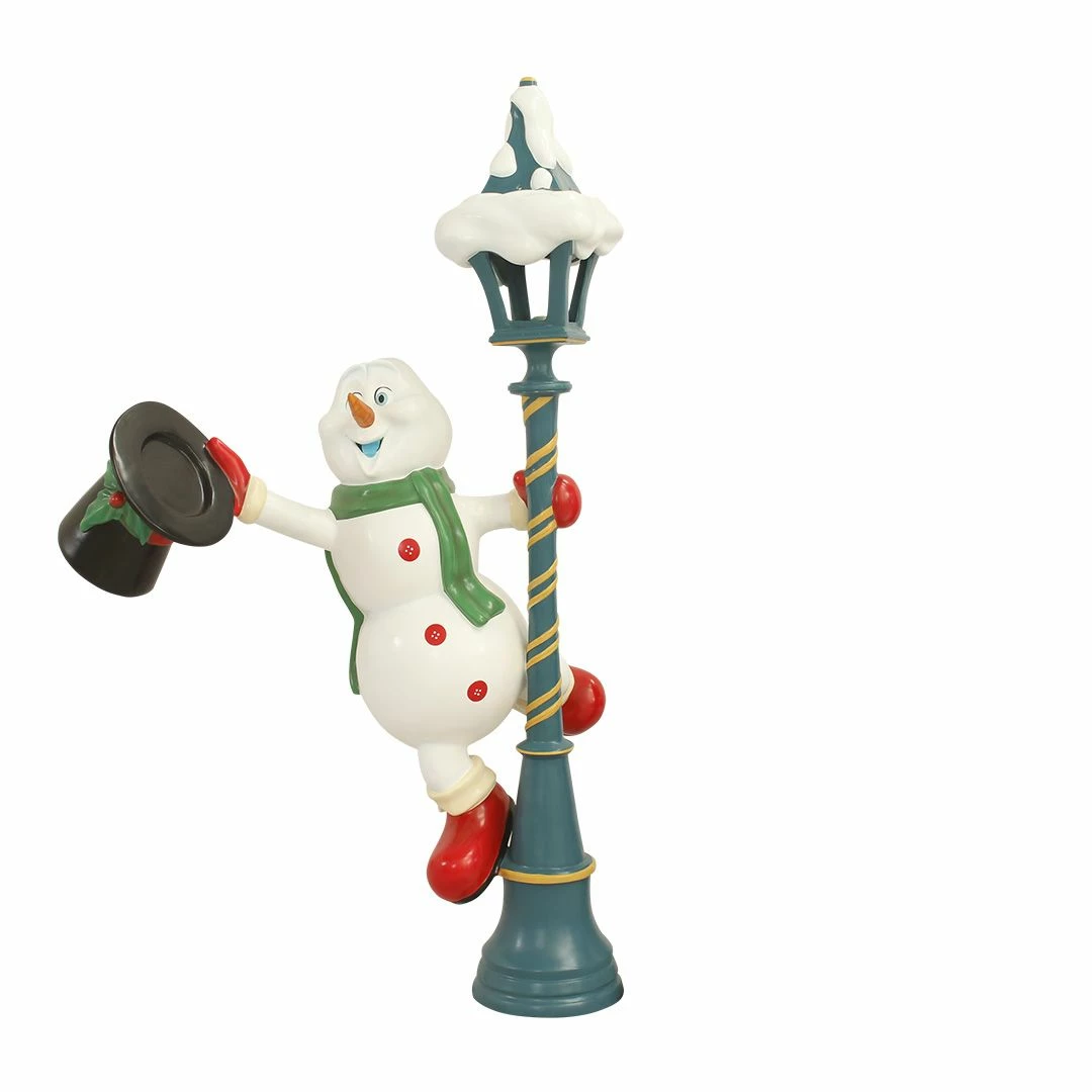 Frosty is joyful and estatic. Tipping his hat off and dancing on this snow covered victorian lampost. Add this spectacular piece to your holiday decor this season.
