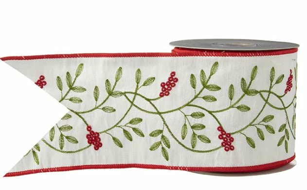 This beautifully embroidered wired ribbon features delicate holly berries sprawling out on this crisp linen ribbon. Its edges are wired and overstitched with red thread, making dramatic and voluminous bow creations easy.